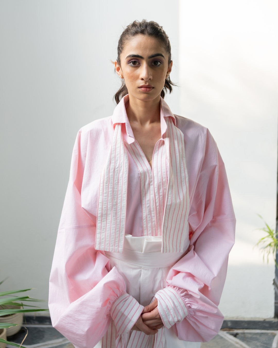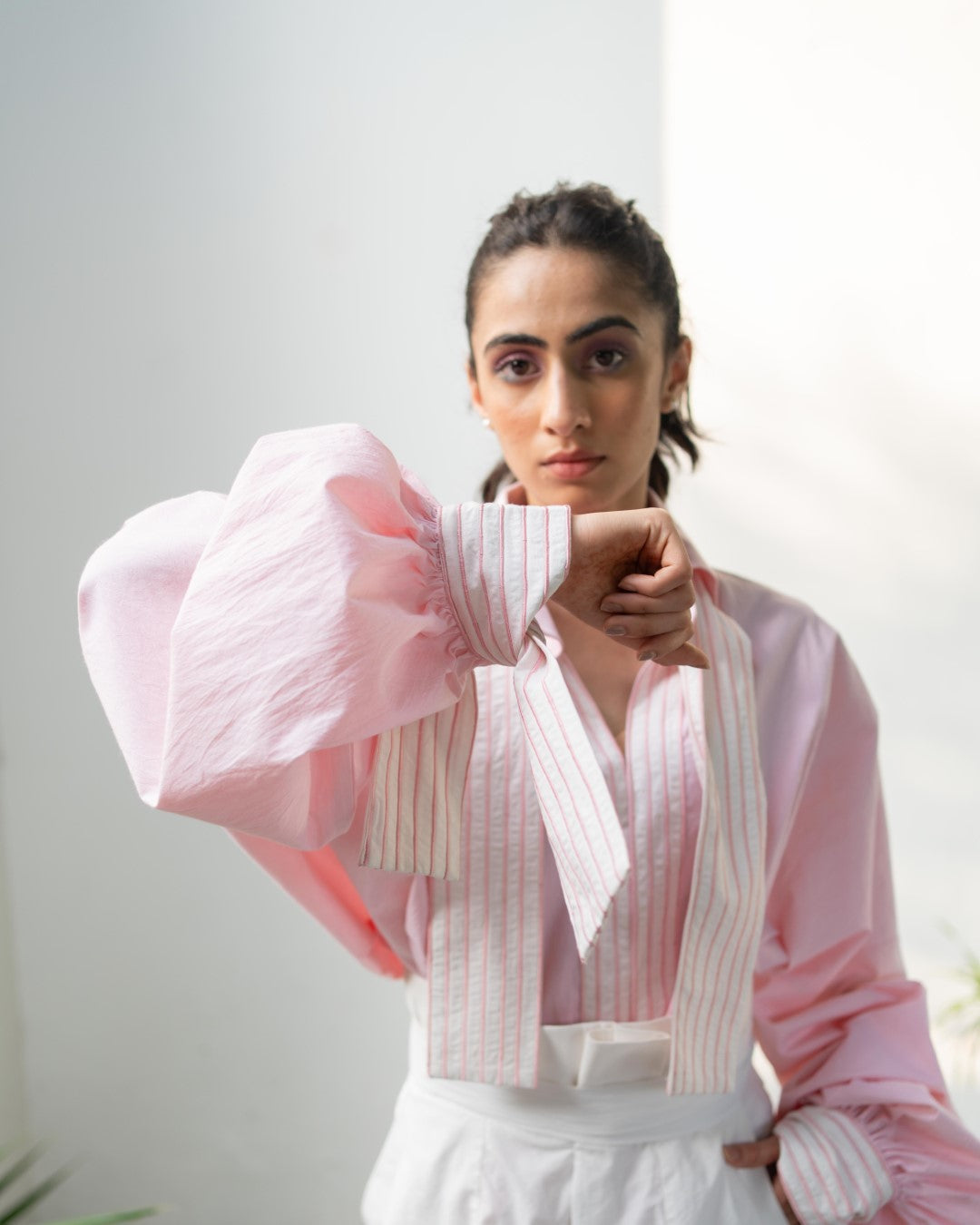 Level up with an effortlessly chic shirt paired with some seriously cool pants. For those unapologetic bosses who bring their A-game, even on a holiday. The ensemble flaunts effortlessly fluttering balloon sleeves, injecting a dose of drama into an impeccably crafted look.