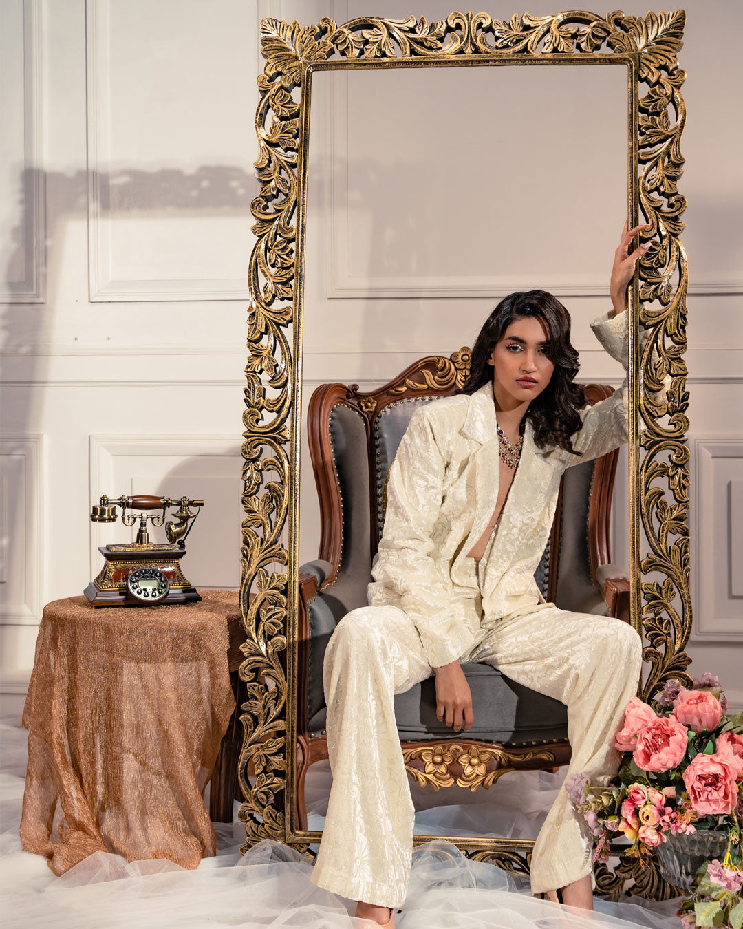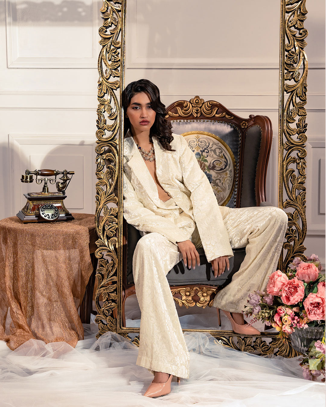 Jacket and free-flowing pants in the warmest shade of white, symbolic of slow romance,