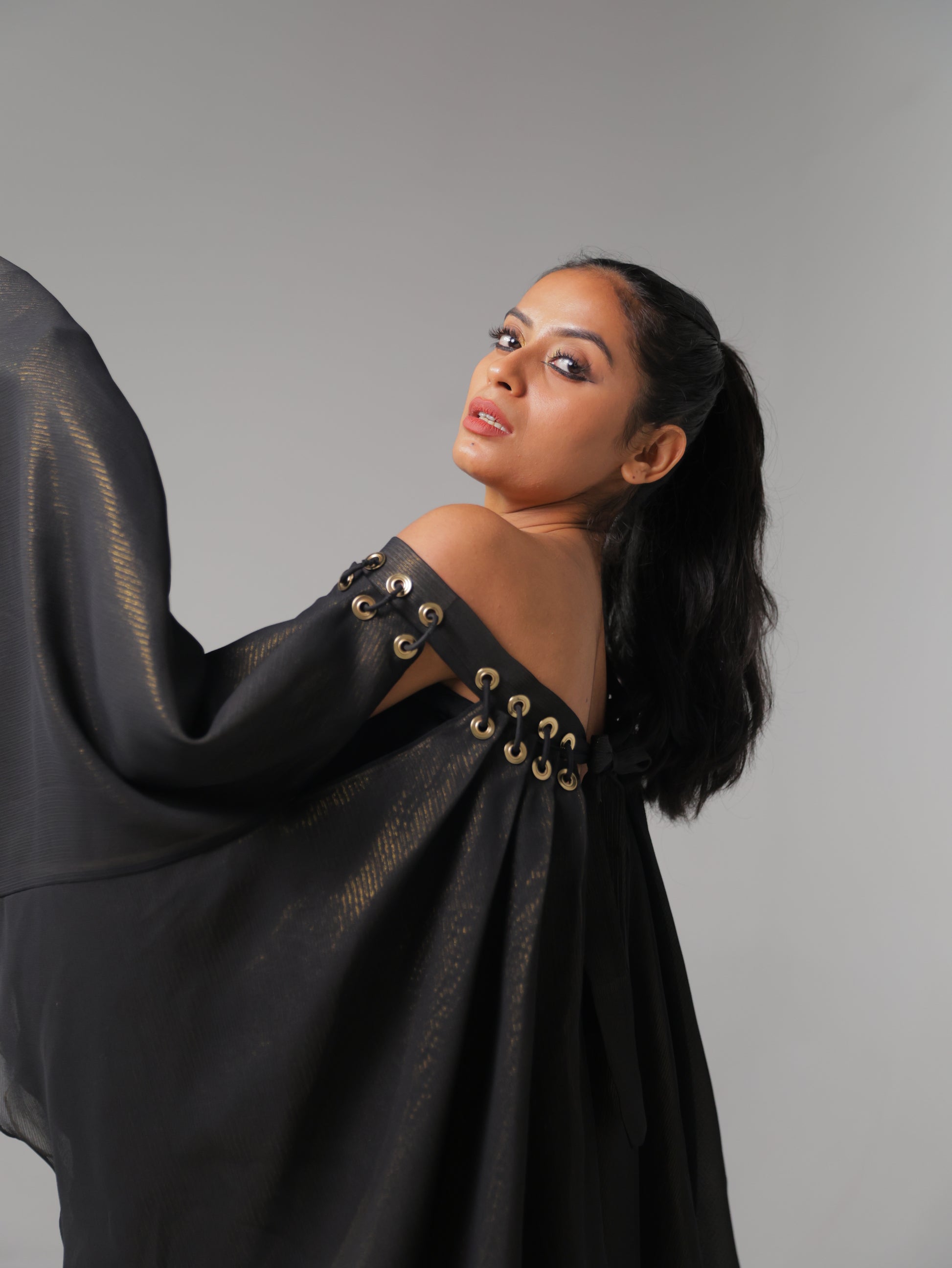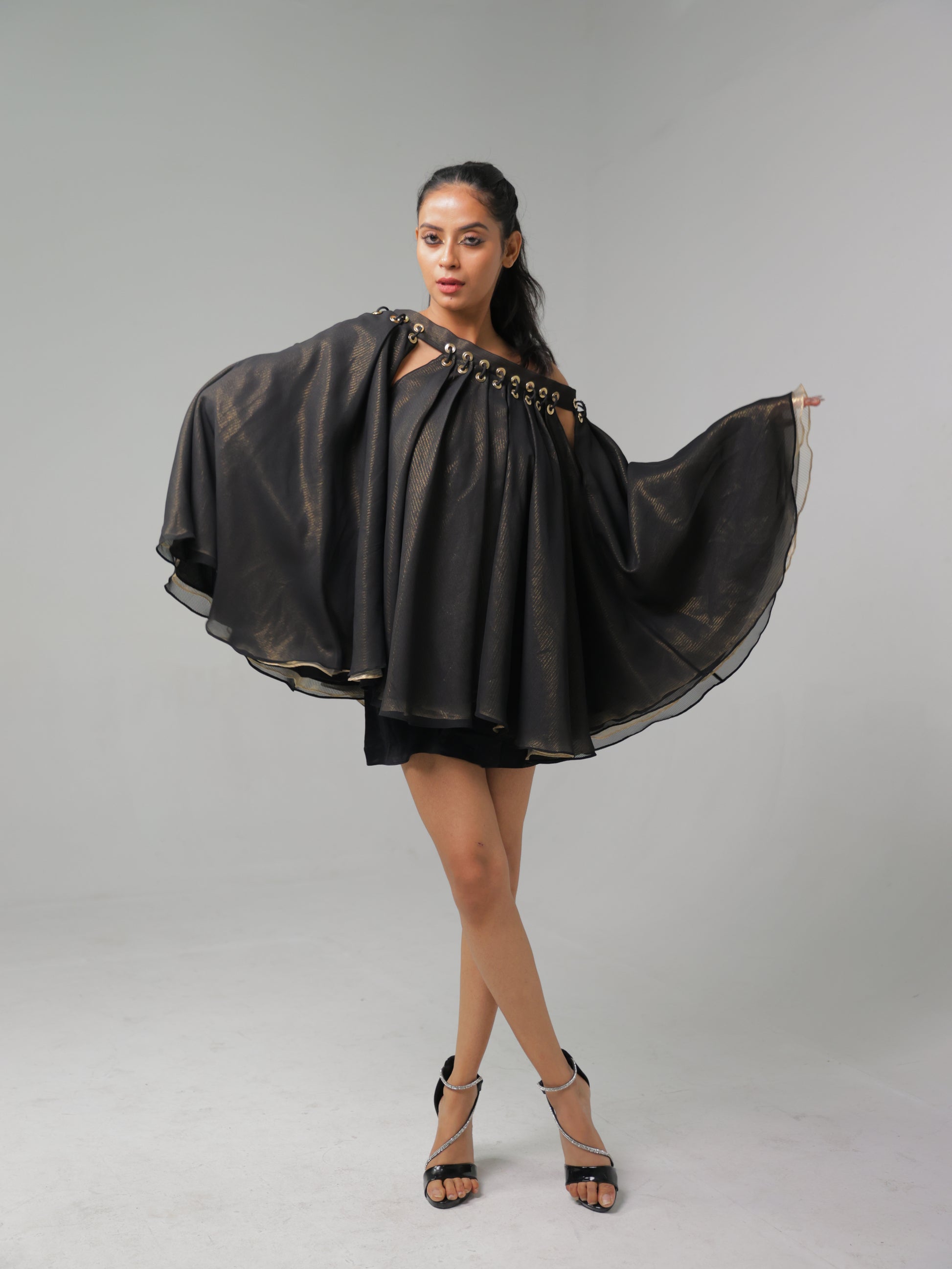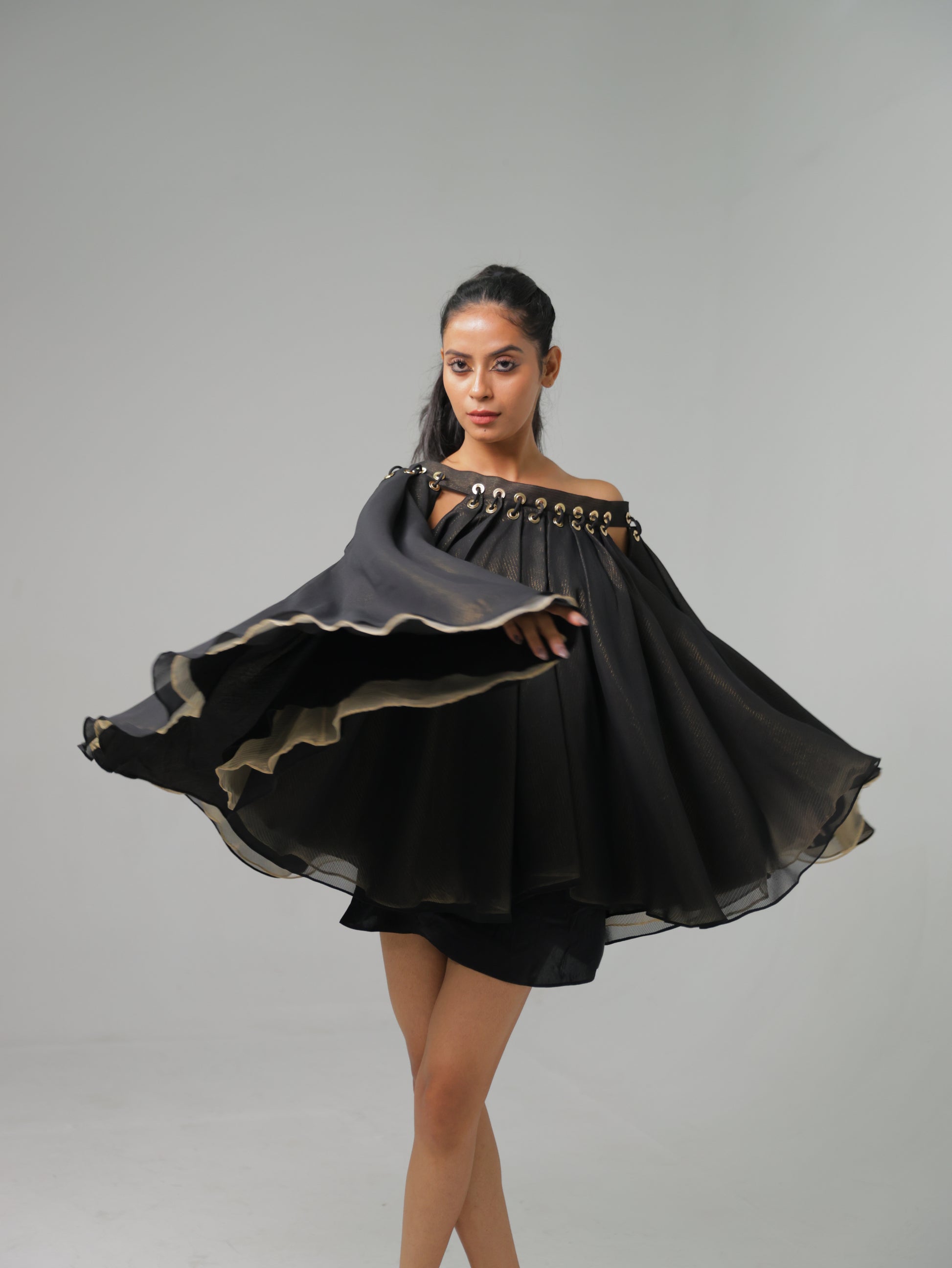 A bold black cape dress with dramatic flow and eyelet detailing along the neckline. This piece combines mystery and elegance, perfect for making a striking impression.